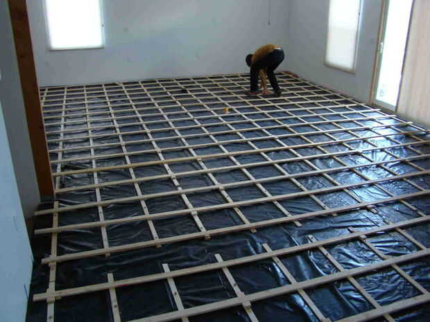 Capa 1: traviesas de Ramset la – estos son los primeros de los durmientes para ir abajo en el hormigón y se coloque en su lugar con polvo activado "Ramset" clavos para clavarlos profundamente en el concreto. Su espesor puede ajustarse ya que están diseñados para mantener un espacio libre para la cama suspendida para en. Debido a que se trataba de un nuevo piso concreto, también utilizamos una barrera de vapor de polietileno entre el concreto y el enrejado de madera. La losa continuará arrastrar la humedad con el tiempo y habrá una tendencia para la humedad exterior migrar en el suelo dentro de la Fundación por lo que no queremos cualquier humedad futuro ser capaces de migrar hasta en el trabajo de enrejado de madera. En ambientes más húmedos, esto podría presentar un gran problema sin ventilación del subsuelo.