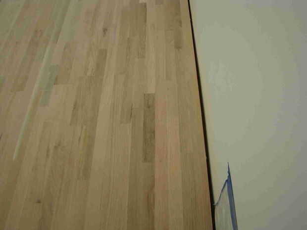El substrato de madera contrachapada de ¾" y el roble del suelo sí mismo se instala de una manera que dejará un espacio limpio de ¾" a lo largo de todas las paredes. Esto responde al propósito de permitir que el piso del espacio para expandirse sin abrochar y también proporciona un canal a un espacio libre debajo de la estructura de piso apretado donde nosotros podríamos colocar cables de audio y multimedios para su uso con instrumentos amplificados o las sesiones de grabación profesional.