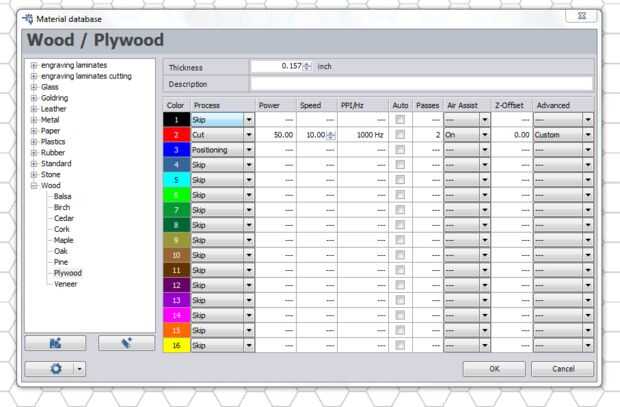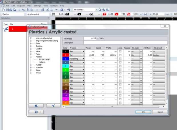 He estado usando la misma configuración de potencia y velocidad para acrílico y PLA. Como era de esperar, cartulina corta más rápido y a un nivel inferior de energía. Configuración de windows para ambos está en la foto.