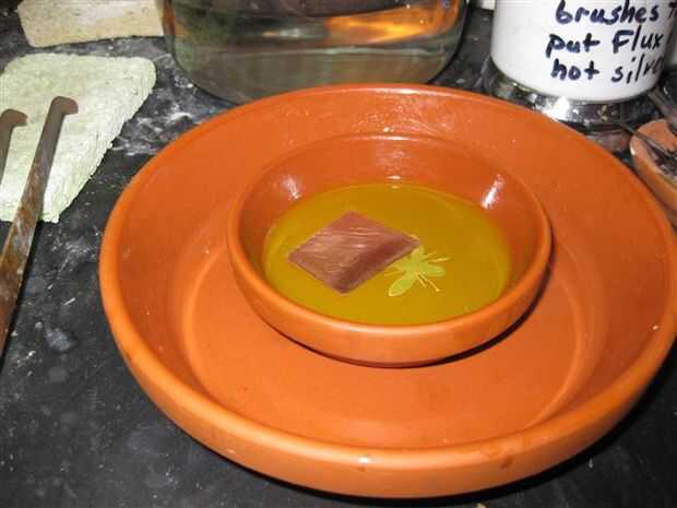 Puse en ambas piezas en flujo líquido, esto sirve dos propósitos, uno para que el flujo de soldadura y la segunda es para reducir la escala de fuego (ennegrecimiento) de cobre.