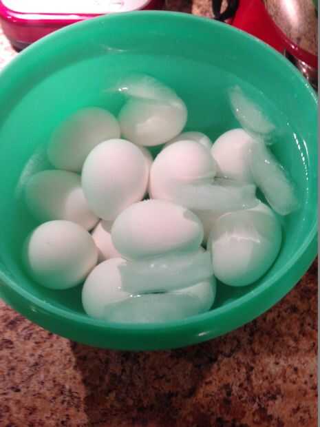 -Después de retirar los huevos del agua hirviendo Coloque en el agua helada y dejan enfriar unos 20 minutos. * Nota: una vez los huevos en el agua de hielo, usted puede poner el recipiente de los huevos en la nevera para dejar enfriar por 20 minutos.