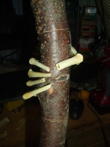 A continuación, sostenía el palo en mi mano lo que quería que se llevó a cabo y estudió cómo mis dedos eran arrenged. No en el detalle anatómico, sino a conseguir el principio general de "qué dígito va donde". Entonces comencé pegando la primera pieza - el "alcance" - a la rama usando pegamento caliente. Elegí una altura más o menos sobre eso del codo de la rata.