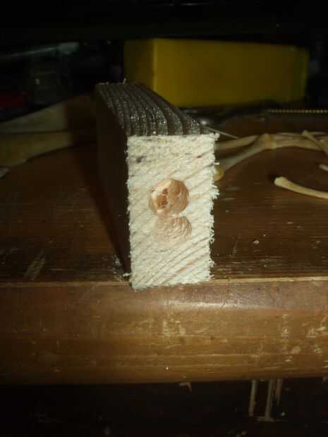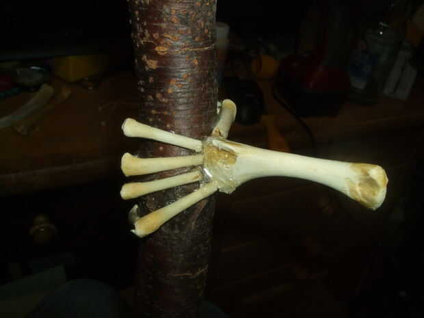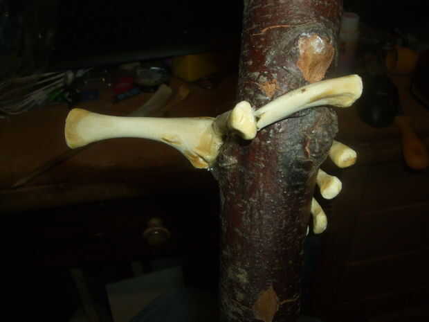 Como se aprecia en las fotos he utilizado un taladro de madera, hacer dos agujeros para un total apertura un poco más grande que el hueso y aproximadamente 1,5 cm de profundidad. Moviendo el taladro quité la madera restante entre los dos agujeros. Luego he probado si iría y una vez que lo hizo, poner pegamento caliente en el orificio y presiona el hueso dentro.