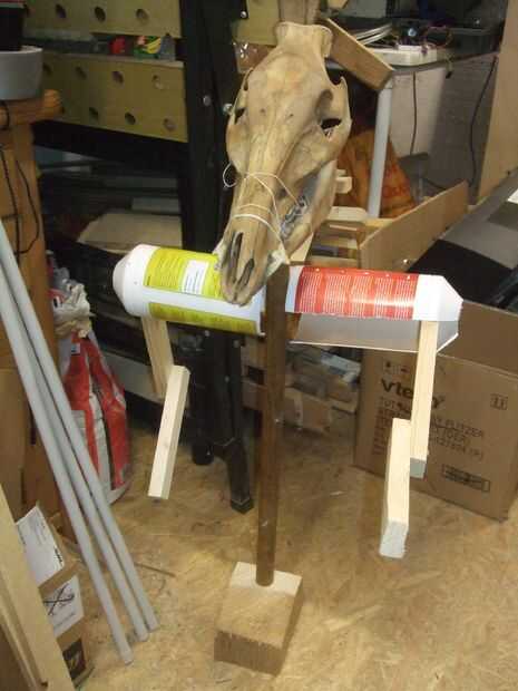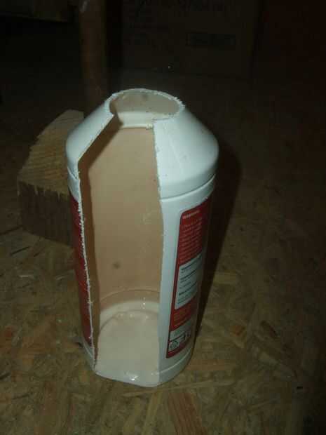 Encontré dos botellas plásticas de igual tamaño y adecuada longitud. USA (hack) vieron que cortar la parte inferior y el casquillo como hilo de rosca (los dos más adelante seguí para futuro mayhem). Luego corté una ranura vertical en la botella todo el camino a través, como se ve en las fotos (aunque parece que lo hice al revés, a juzgar por esa foto). Hice la ranura suficientemente amplia para que las botellas cabrían sobre los hombros y los brazos.
