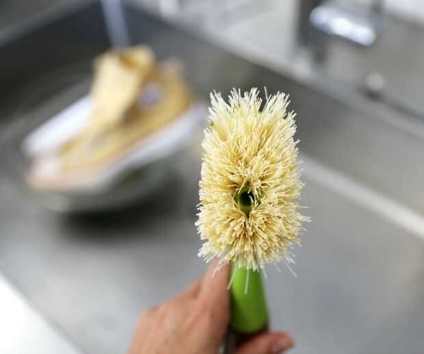 Usando un cepillo de cerdas rígido y moviendo en círculos pequeños, pulse las cerdas en la goma con una pequeña cantidad de líquido de lavado del plato, hasta que la mancha haya desaparecido.