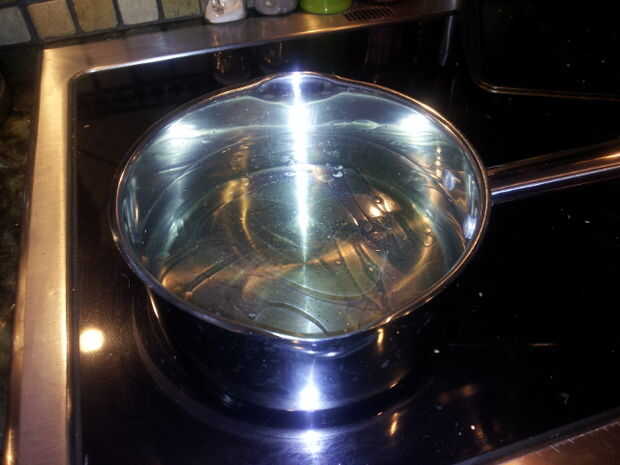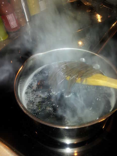 -Hervir el agua con unas gotas de aceite y añadirle unas gotas de colorante negro.