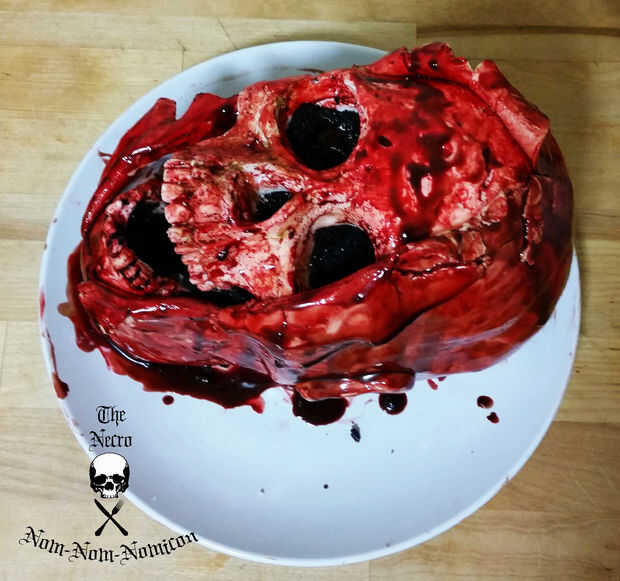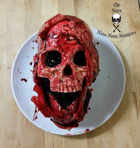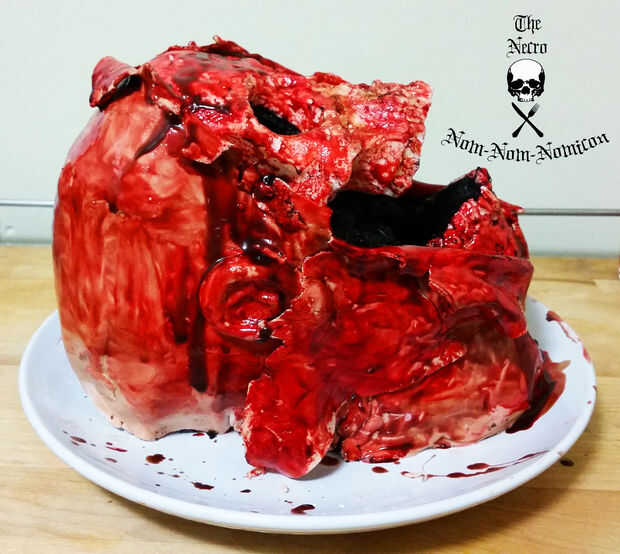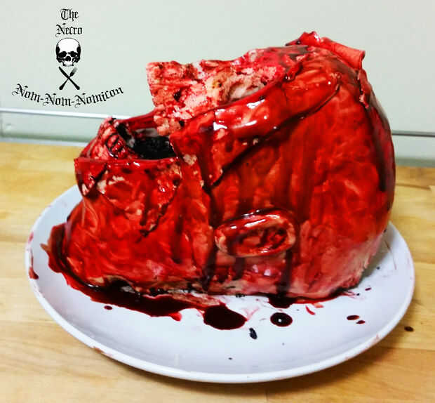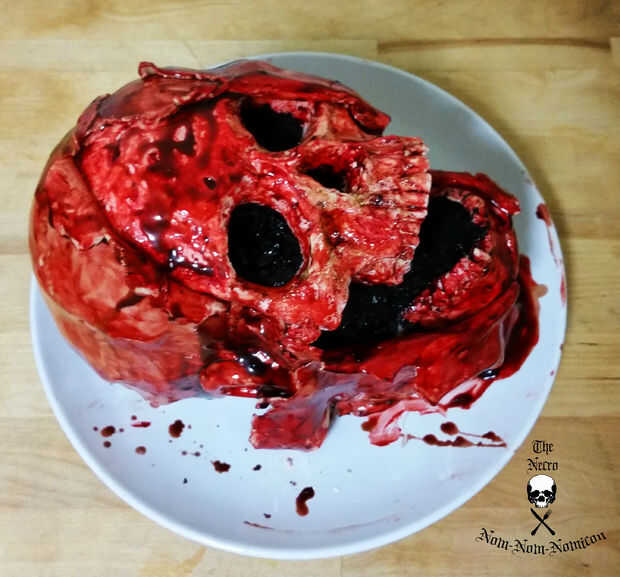 Usando una brocha o las manos, quiere untar esta mezcla en todo el exterior de su torta en el fondant. Ahora, con cuidado retire el fondant a lo largo de la línea de corte, revelando su cráneo y pastel debajo. Otra vez, con su pincel y su mezcla de jarabe de chocolate, añadir en sangre a tu pastel. Para hacer el interior de sus aletas verdaderamente sangriento y jugoso, me había pintado directamente con el colorante de alimento rojo gel y luego hizo un ligero lavado marrón de jarabe de chocolate sobre eso.
