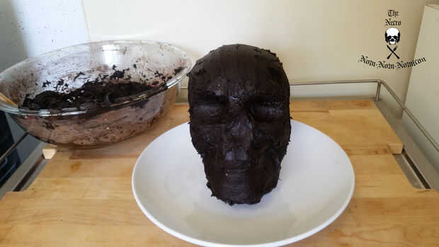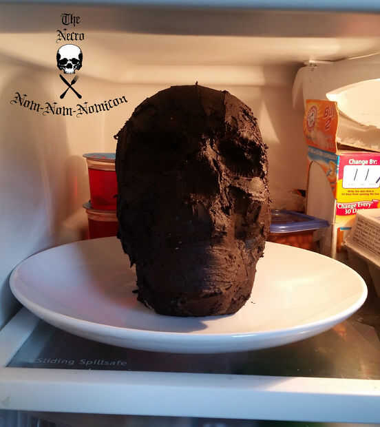 Con el buttercream frosting, unir las dos mitades de su torta de cráneo y aplique una capa de miga fina de glaseado sobre la cosa entera. Cubrir con papel plástico y refrigerar por al menos una hora.