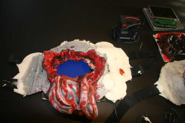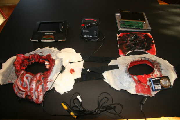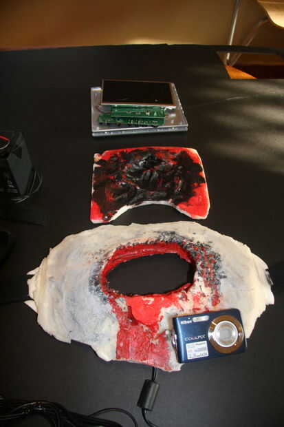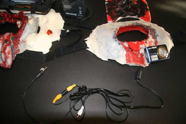 Originalmente planeaba sobre el uso de cámaras espía que se ejecutan de 9volts proporcionar mi vivo. Sin embargo, los $10 que he recibido de ebay eran cutres (duh) y murieron enseguida. Tuve que improvisar y utilizar lo que tenía, y me ha pasado a tener dos Nikon Coolpix digitales disponibles. Corté los bolsillos en la espuma de las cámaras para sentarse y un agujero para las lentes de pop a través de.
