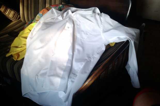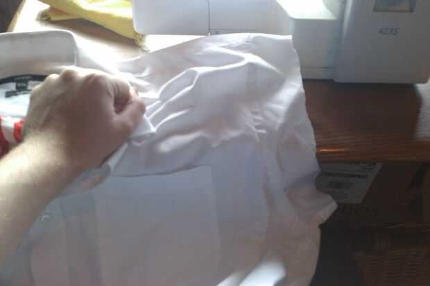 Como mi camisa blanca mangas largas, que el primer trabajo fue cortar las mangas casi por completo, dejé una o dos pulgadas en el extremo. Entonces todo lo que tenía que hacer era sencillamente un agujero en el extremo del pie de uno de los pares de calcetines, tire hacia arriba y seguridad los pines a la camisa.