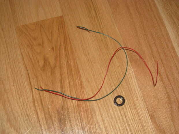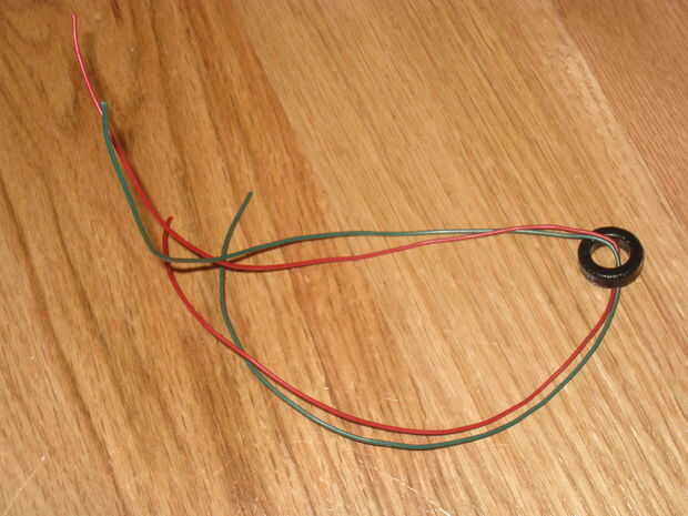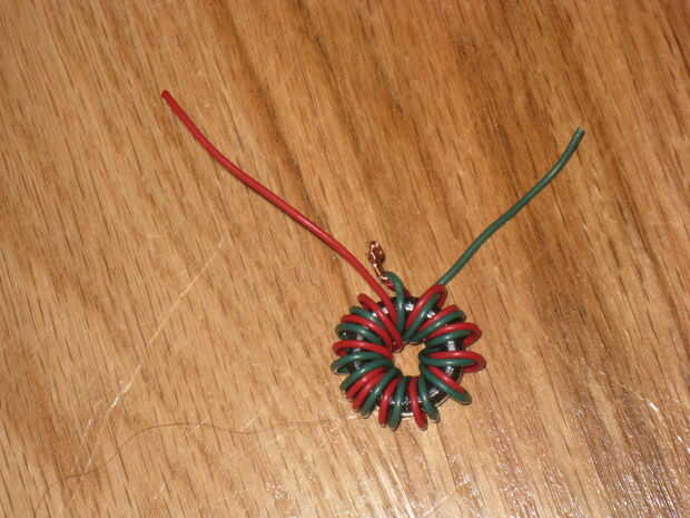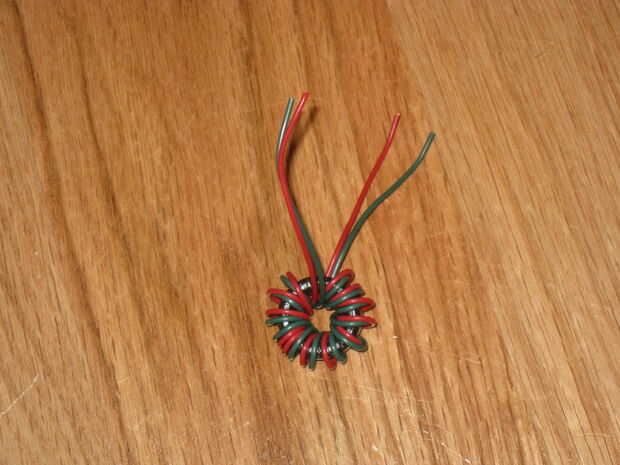2 mismo longitudes de alambre y doblarlos juntos para encontrar un punto central. Poner el cable por el toroide y comenzar igualmente la bobina hasta que tienes una capa entera rodeada por el alambre que debe ser alrededor de 10 vientos. Ahora toma 2 de los cables de colores diferentes y cortar más corto así que no lo son tanto. Quitarlos, girar juntos y les de la soldadura.
