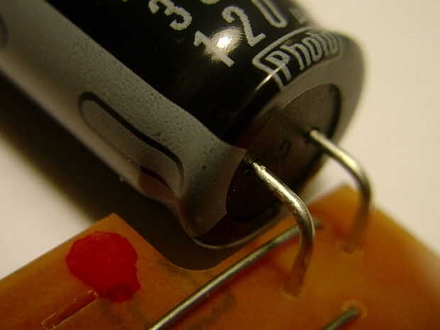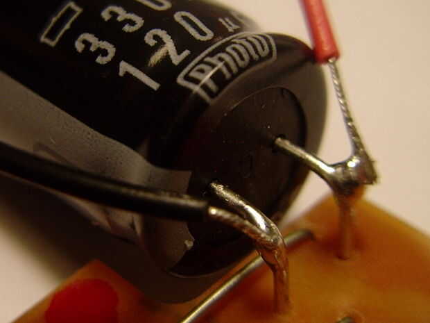Suelde el cable negro del portapilas con el cable del condensador que es la más cercana a la franja gris.