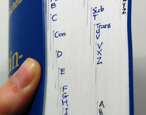 La longitud de las pestañas realmente depende del tamaño de tu libro y el de los pulgares, pero en cualquier lugar de 1.5-2.5 cm (0.5 - 1 adentro) obras. Las pestañas también pueden ser un poco superpuestas para ahorrar espacio (hasta aproximadamente mitad de la longitud de cada ficha); ver las fotos a continuación para un ejemplo.