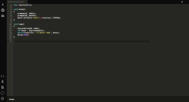 void setup(){ pinMode(D7, INPUT); pinMode(D6, OUTPUT); Spark.variable("result", &resultstr, STRING); } void loop() { digitalWrite(D6, HIGH); int data1 = digitalRead(D7); sprintf(resultstr, "{\"data1\":%d}", data1); delay(1000); }