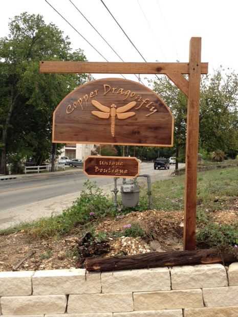 Me pidieron crear un "viejo Inglés Pub estilo cartel" para una tienda/boutique de arte en Boerne, TX (www.copperdragonfly.net). Me dijeron los fundamentos de lo que querían [tamaño, 2 diferentes "señales" (uno grande, uno pequeño debajo), buscar, etc.], pero realmente me permitió "crear" lo que pensé que sería lo mejor. Después de mirar muchos tipos de madera, decidí hacer el signo real de nuez y luego utilizar cedro para el resto (palabras, frontera, imagen de la libélula, etc.). También sabía esto sería fuera y tomar un montón de abusos por parte del sol y el tiempo, así que tuve que protegerla tanto como pude de los elementos.