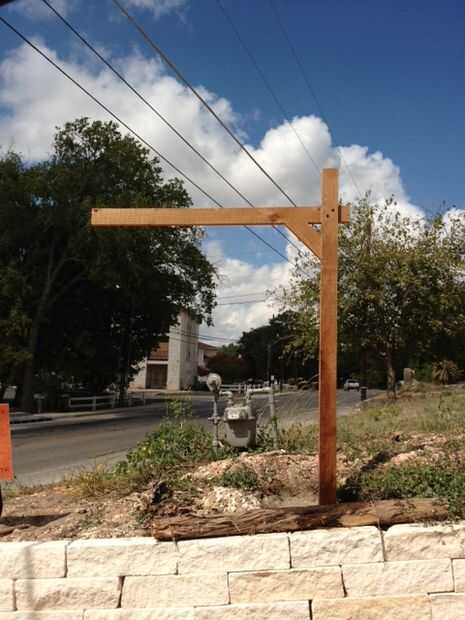Después de eso, instala todo el hardware y construido el post pues para colgar. El poste sí mismo también está hecho de cedro, y para darle una mirada"más viejo", había cincelado por un rectángulo de 2 x 4 a través de los 4 x 4 y martilló el brazo a través con un mazo. Luego agregó 2 tornillos a cada lado y poner otro pedazo de madera de cedro con ángulos de 45 grados para soporte adicional. Una vez que colgó, fue más que suficiente apoyo para la muestra.