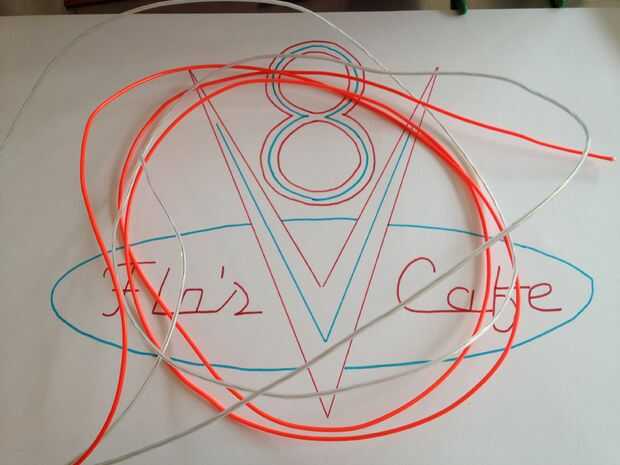 No calculo antes de que pedí, así que tuve que pagar más gastos de envío por una segunda orden de alambre color de rosa. Se puede utilizar cordel o alambre o lo que tengas en mano. Coloque la cadena sobre la señal de cada color en el orden que crees que te conectas cosas para arriba. Intenté utilizar una longitud continua que envuelve la parte trasera puesto que era más fácil hacer que cortar y terminar un montón de trocitos para cada segmento. Una vez que traza cada color, basta con medir la longitud resultante de la cadena y asegúrese de que usted pide por lo menos tanto. Adafruit lo lleva en secciones de 8,2 pies. Tenía alrededor de 11 pies de la rosa.