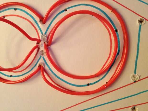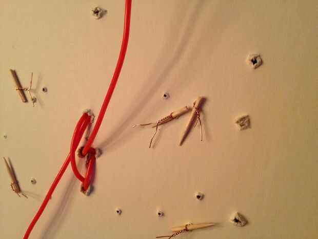 Para fijar EL cable a la señal, usé pequeños bucles de alambre para sujetar EL alambre a la Junta.  Pasé el cable alrededor de EL alambre y en la parte posterior la conecté a un trozo de palillo de dientes para asegurar la parte posterior.  Entonces todo lo que tenía que hacer era torcer el alambre hasta que fue seguro.