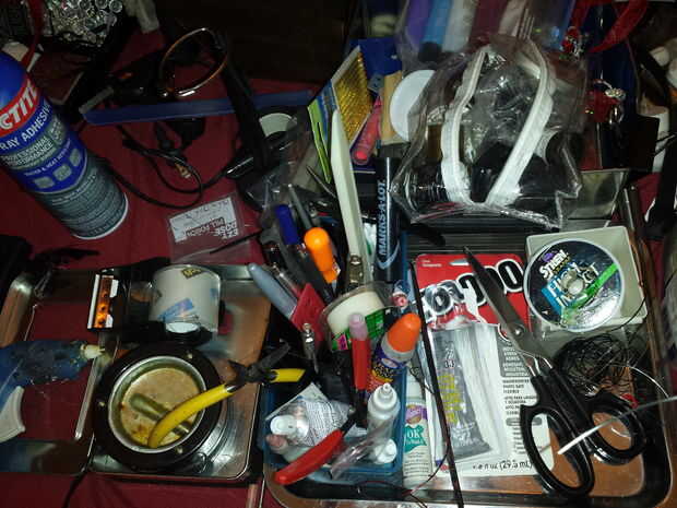 Materiales de arte básicas: tijeras, cuchillo del exacto, cinta, adhesivos E600 es lo que uso, pegamento, adhesivo en aerosol, alambre, hilo y agujas