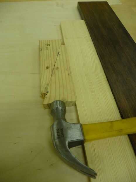 Avellanada algunos agujeros en la base de la plantilla que podría utilizar tornillos de latón para sujetar a la mesa de shopbot.  Una vez en su lugar, puse mi signo en blanco en y martillado las cuñas apretado.