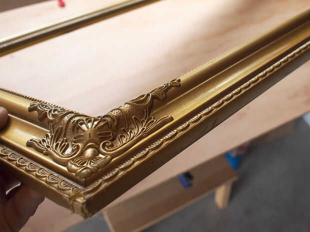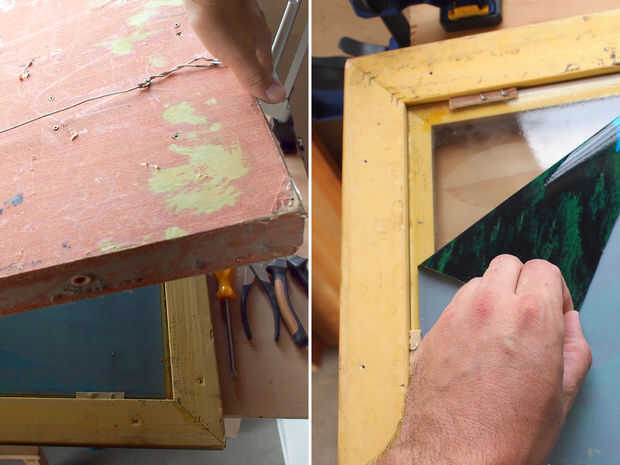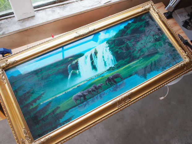 El marco de la copia de seguridad se llevó a cabo con acabados de uñas que se alzaprima flojamente, el cristal tenía una calcomanía de la escena de la cascada que tuvo que ser quitado, también. El vidrio tenía residuos de pegamento en un lado, y lo que sólo puede ser descrito como el pesar de 1000 comidas en restaurantes malos en la parte delantera. Usé pesado limpiador con lejía para limpiar ambas superficies del vidrio.
