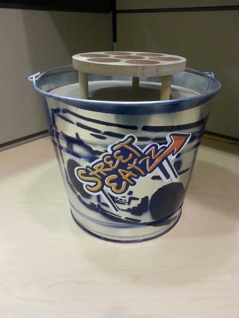 Un comienzo local empresa de alimentos puso en contacto conmigo para ver si me podía ayudar con una pantalla de ventas promocional para su nueva línea de salsa picante. Lo que es un graffiti cubo de metal con inserciones de madera para sostener las botellas hasta la altura del espectador con su logo aplicado en la parte delantera.