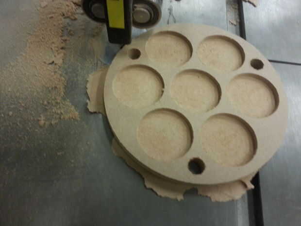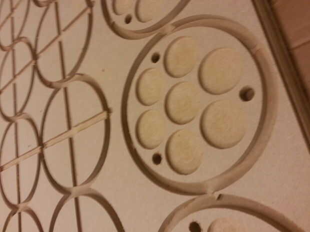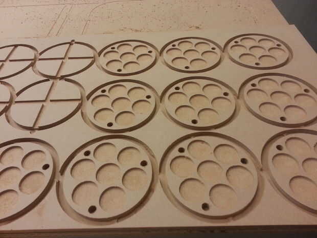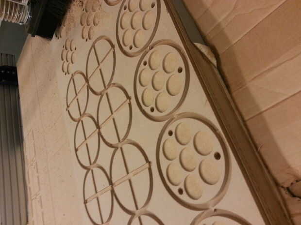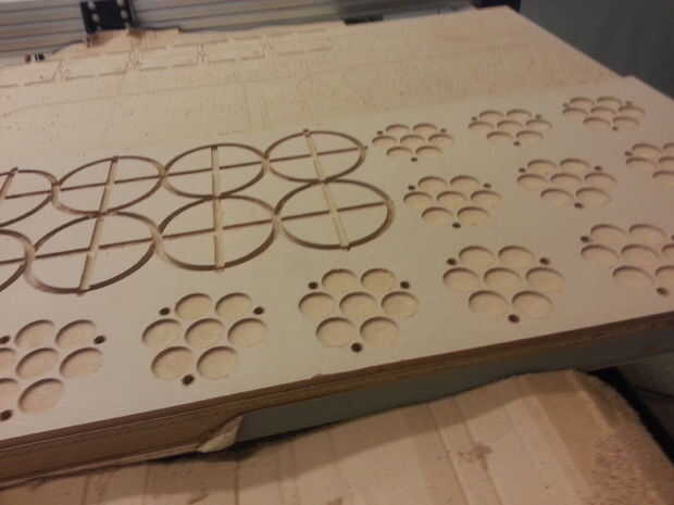 Una vez que está configurado correctamente y ha exportado sus rutas con el formato de ShopBot, la computadora ejecutará el router a través de la una ruta ruta lista a la vez. En nuestro caso, los agujeros de taladros en primer lugar, luego tras un cambio de herramienta de corte, gubias los bolsillos y finalmente corta los círculos de la hoja. Una vez completado, algunos adicionales limpieza pueden requerir en sus piezas en la sierra.