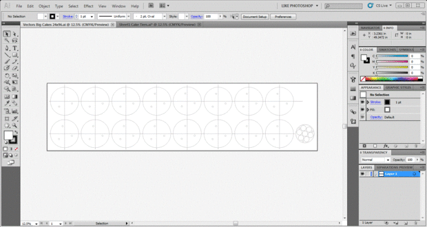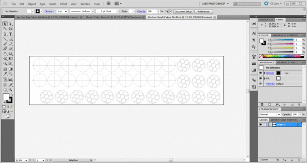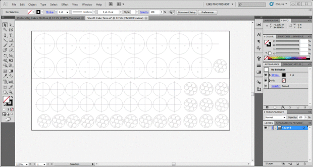Una vez que los prototipos probaron acertados, ya era hora de mover el diseño en la computadora para la producción masiva en el ShopBot. Un par de consideraciones antes de comenzar su diseño. Primero algunas cosas prácticas. El sistema de ShopBot TechShop Detroit/Allen Park tendrá una completo de 4'x 8' hoja de madera contrachapada y si anida sus piezas (ponerlos como muy cerca como mecánicamente y segura posible) se pueden replicar muy pocos elementos de una hoja de MDF. Quizás más importantemente sin embargo, mi coche no transporte una completa hoja de MDF por lo que mis diseños son todo hecho en hojas de 2'x 8' como tengo que tener los chicos en Home Depot ripearlos longitudinalmente así puedo transportarlos desde el almacén de TechShop. Un aspecto secundario, si está utilizando una máquina que no sea la suya, es la cantidad de tiempo que tarda el router completar un trabajo. Cita en la máquina en TechShop, por lo que asegúrese de que usted puede terminar su trabajo en el tiempo permitido. Romper trabajos a la mitad me permite mejor control de límites de tiempo. Se muestra arriba es una sola hoja de MDF con casi todos los círculos necesarios para completar el proyecto. Tenga en cuenta la línea horizontal que divide la hoja por la mitad para planificar como finalmente se trata de dos empleos de media hoja. Más tarde una segunda hoja, tradicional Sierra de mesa se utilizará técnicas para cortar los bloques que se convertirán en las patas. El arte que haces en tu programa de dibujo basado en vectores es básicamente sólo rutas de acceso para el router para seguir, por lo que no participa ninguna habilidad especial que poder imaginar lo que un router poco más que una línea va a hacer a su obra de arte. Todas las cosas realmente importantes, como la profundidad y cómo todo el corte, es manejado por otra pieza de software se descarga estos caminos en.