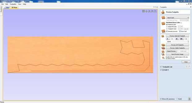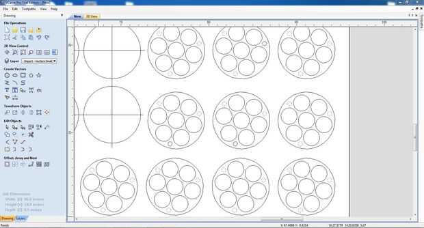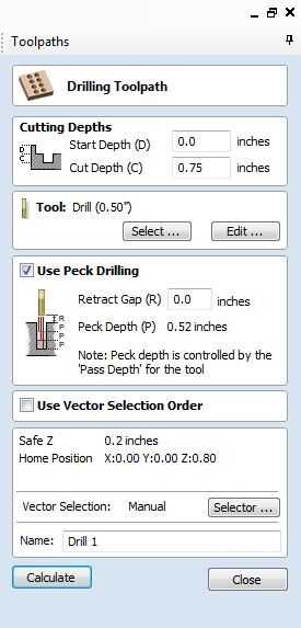 Para cerrar la pestaña de herramientas de dibujo y mover a la pestaña de trayectorias de herramienta, haga clic en el interruptor de botón de la ruta de la herramienta (último a la derecha en la sección de control de vista 2D) en el lado derecho de la pantalla, ahora tienes una nueva serie de herramientas en un panel en el lado derecho de la pantalla. Estas herramientas Dile el bot de la tienda Qué hacer mientras sigue los caminos que has importado. ¿Se debe cortar, perforar, o arañar? Puedes decirlo aquí. Hay un poco de delicadeza con creación de rutas cortadas - especialmente varias rutas si utilizan diferentes herramientas. Usted quiere asegurarse de que completar las operaciones en un orden que es seguro y beneficioso. por ejemplo, perforación y fresado de bolsillos (escopleo con gubia de un área a una profundidad menor que el espesor completo de la Junta) ponen mucho estrés en un área. En este ejemplo cada círculo tiene una especie de camino en su interior es ya sea perforado enrutada o arrancado todos los debo realizar antes de que digo la cuchilla para cortar el círculo delimitador. Un router gira rápidamente y con mucha fuerza, por lo que quiero hacer lo que necesito para el centro de cada objeto antes de ese objeto libre de la estructura circundante que sostiene en su lugar :) Quiero perforar mi primero, así que seleccionaré todos los caminos que representan los agujeros a taladrar, luego Dile la trayectoria de la herramienta que estas son a perforar, profundidad para perforarlos y si es necesario qué orden. Para empezar, seleccione todas las trayectorias de perforación (mantenga pulsada la tecla Mayús mientras hace clic en cada vector de taladro). Una vez seleccionadas todas las perforaciones, seleccione la herramienta de trazado de herramienta de perforación de la plataforma de trayectorias de herramienta. Seleccionar la herramienta con abrir la configuración de diálogo caja. En el cuadro, le configure el tamaño de pedacito de taladro, la profundidad desea al taladro y el estilo de taladro (peck, o un paso) una vez su configuración es correcta, puede hacer clic en el botón calcular y el software averiguar la trayectoria de herramientas e incluso animar en 3d las herramientas ruta y proceso para perforar los agujeros. Última foto es la ruta completa, perforada y lista para el siguiente paso.