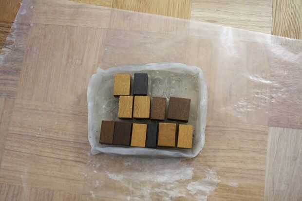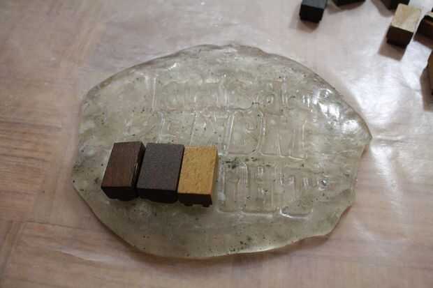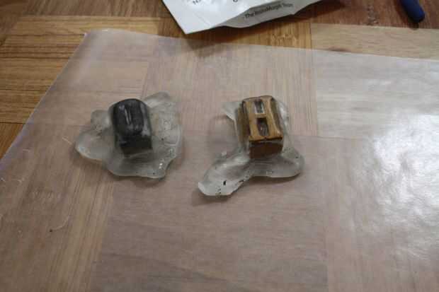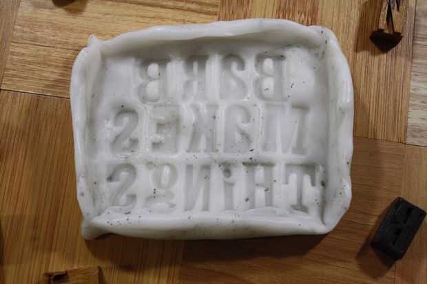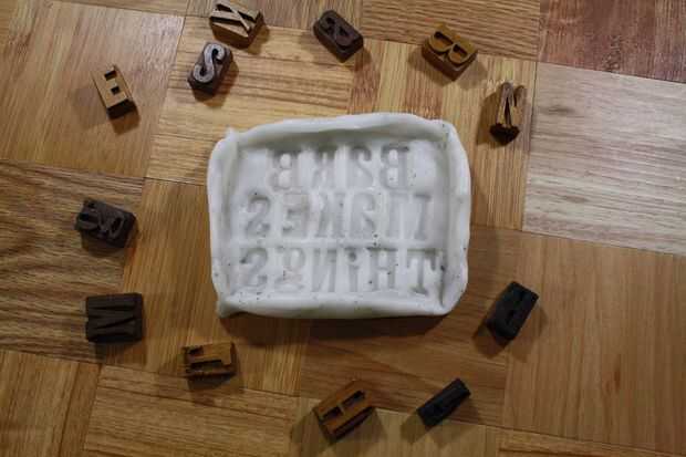 Calentar el material termoplástico en la prensa en una tortilla gruesa y agua caliente, luego oprima las letras deseadas en el plástico, dejando un poco extra alrededor de los bordes. Una vez que tengas todas tus impresiones de la carta, tomar el exceso de plástico y dóblelo hasta hacer paredes para su molde.