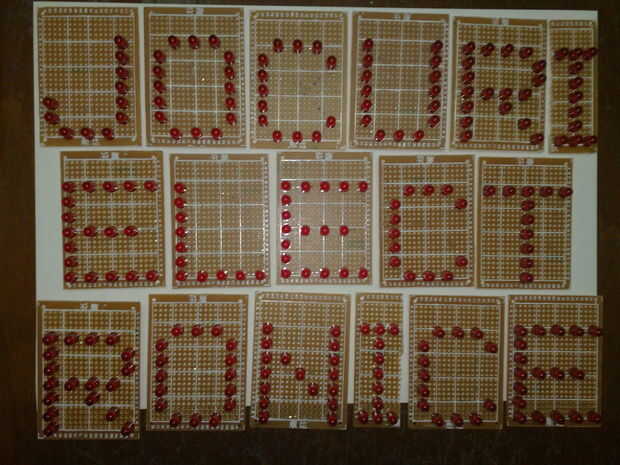 Cuando el recinto fue hecho, comencé a trabajar en las letras. Empujaron hacia abajo así que tocaron el tablero y soldadas en la parte inferior. Cuando termines con eso también, cortar los pernos en la Junta del solador y guardar las piezas. Cables exceso pin LED son una buena cosa, no tire, se pueden utilizar más adelante los cables de puente como almohadilla. Nosotros los utilizamos para conectar los LEDs en serie, demasiado.
