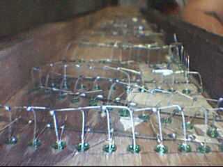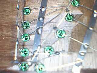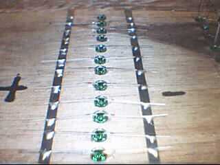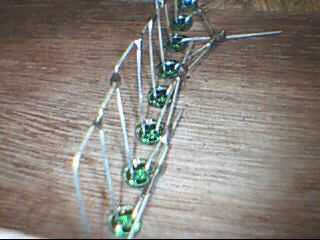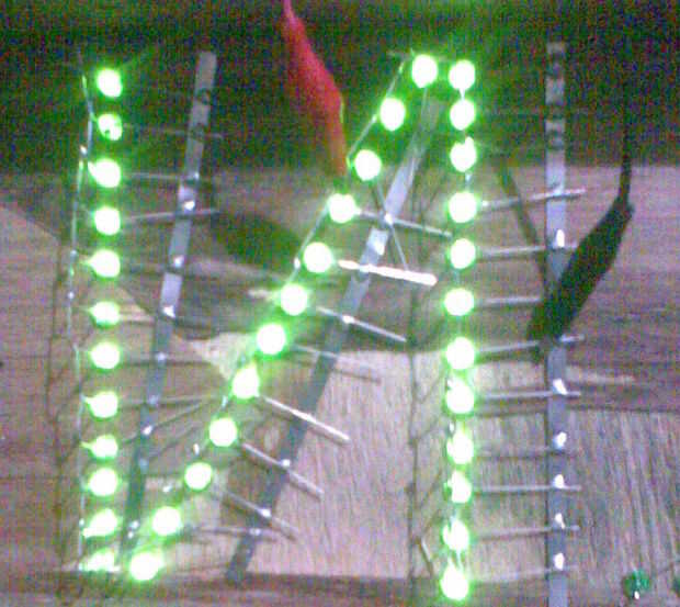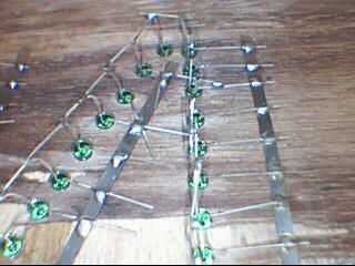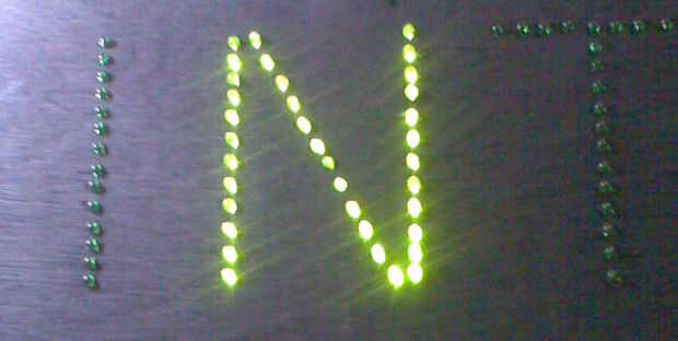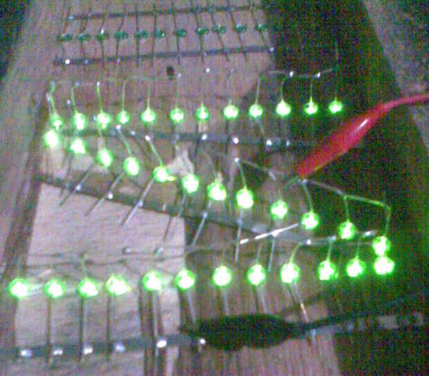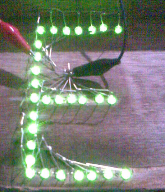 Empiezo con la primera letra, todos los cátodos Haz soldado juntos (negativo de plomo más corto) y todos los ánodos de conseguir juntos soldadas (conduce más positivo). Terminó la carta. Ir a la letra siguiente, repetir hasta que se completen todas las 10 letras. Todos los motivos son la conexión entre ellos por un bus de tierra de la correa de la batería.