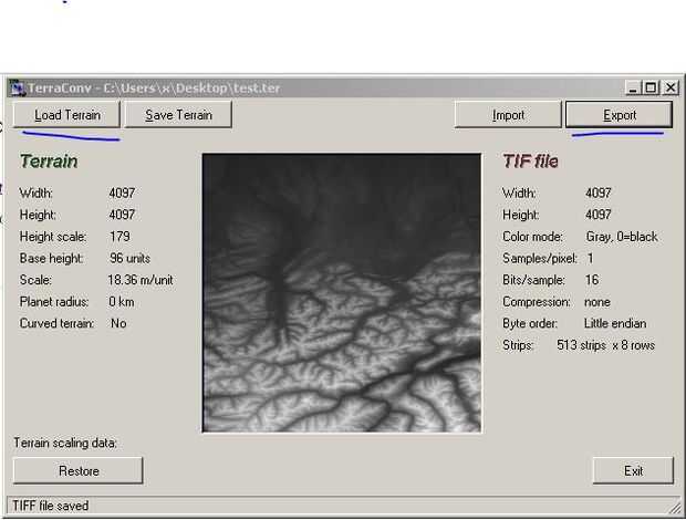 Abrir el archivo resultante de terragen TerraConv (puede tardar algún tiempo), luego exportar y guardar.