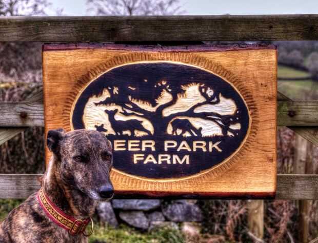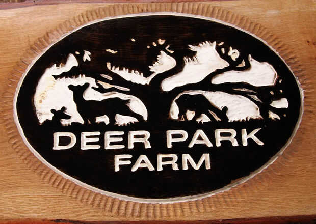 Dos muestras de la casa fueron creados aquí, con crecientes grados de complejidad. El segundo signo, 'Deer Park Farm', dieron un profundo acabado quemado con un soplete para crear el alto contraste que el diseño requerido. El costo de este proyecto era prácticamente cero como la madera vino de Parque de los ciervos - sólo una lata de barniz de yate en 10 quid - el cincel de energía fue amablemente donado por Arbortech.