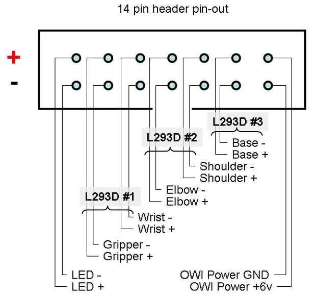 Conexión para el brazo robótico se realiza a través de 14 filas doble Jefe del pin de (según la foto de arriba) por medio de cable plano de 14 hilos.