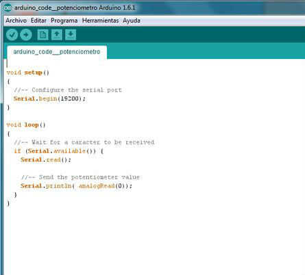 queda esperando a recibir inteligentes. En cuanto llega uno (da igual cuál sea), se lee la entrada analógica donde está conectado el potenciómetro y se envía su valor de vuelta. De esta forma es el PC el controla el flujo de la lectura del potenciómetro.