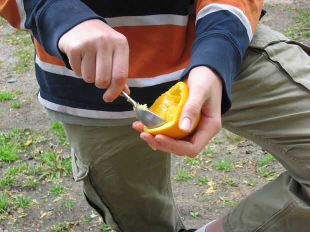 Tomar la cuchara y sacar todas las agallas naranja hacia fuera. Existe un método a él. Llevar la cuchara todo el camino alrededor del borde para aflojar la naranja. seguir adelante más y más profundo. Una vez que estás cerca de la parte inferior, utilizar la cuchara como una palanca y saque las tripas naranja. 5 puntos si usted consigue todo en una sola pieza!