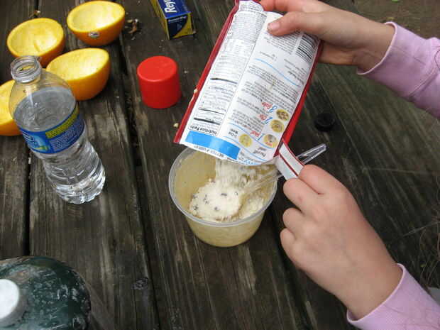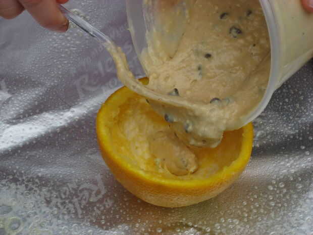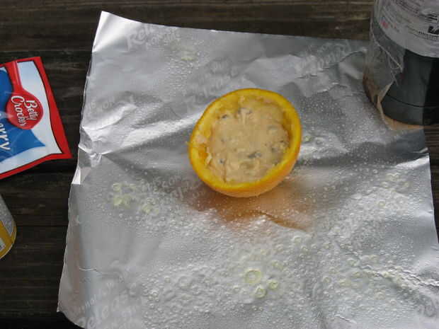 Si tienes el solo add mezcla de agua, poner en un bol y, bueno, apenas agregue el agua! Si traen una mezcla casera con usted, saltar esa parte. Vierta la mezcla en la piel de naranja hasta que quede un centímetro (.4 pulgadas) desde la parte superior.