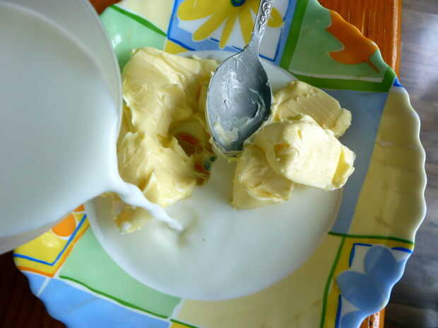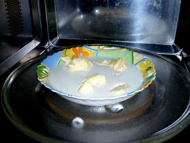Después la leche y la mantequilla juntos y ponerlos en el microondas para que se derrita la mantequilla.