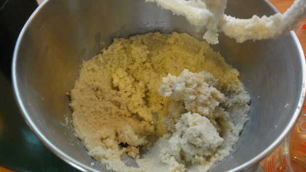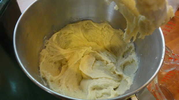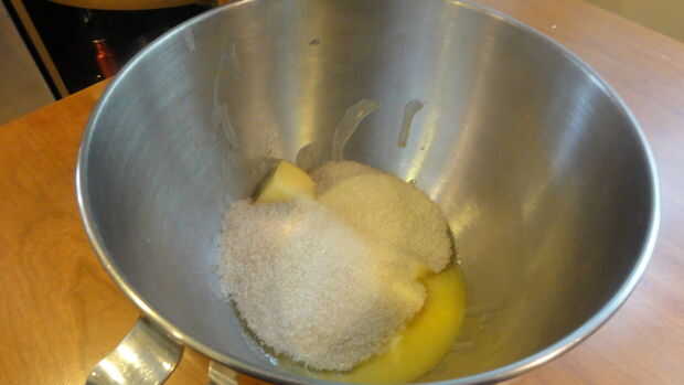 Mezcle la mantequilla y el azúcar en una batidora eléctrica. Una vez todo esponjoso, añadir los huevos, batiendo bien.