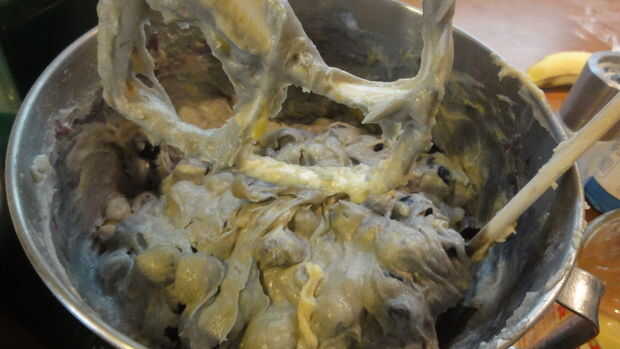 Añadir a la mezcla seca a la mezcla húmeda y mezcla bien. Luego agregar los plátanos, yogurt, vainilla y los arándanos.