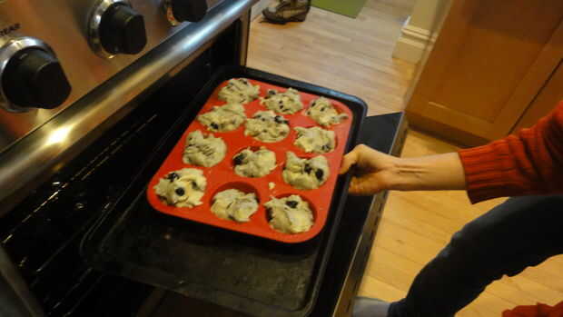Deliciosos muffins con un centro de arándano. Esta receta es para 16 magdalenas – Yum!Ingredientes280g (10oz) harina de yo levantarpizca de sal100g (40oz) de azúcar impalpable1 plátano picado1 huevo240ml de lechemanteca 85g (3oz) derretidoarándanos d