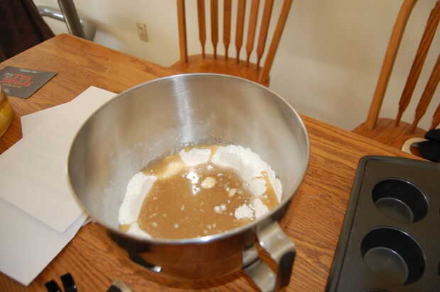 Mezcle la harina, la sal y el polvo de hornear en un tazón grande y luego crear un cráter en el centro. Este es el método básico muffin en la hornada (clase de alimentos de la escuela secundaria gracias). Mezclar la grasa de tocino, leche, huevo y sirope de arce y viértala en el cráter de mercancías secas. Mezclarlo todo en una masa. Habrá terrones.
