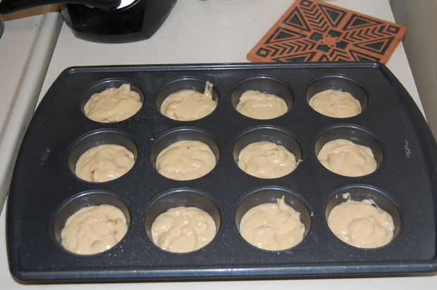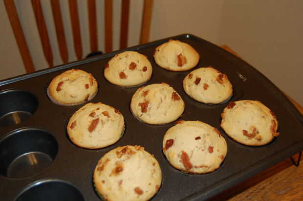 Tengo un 12 bollitos. En mi primera partida eran demasiado pequeños y sólo había untado el pan. Terminaron por ser demasiado pequeña y un poco demasiado dorados en la parte inferior. Mis lotes de segunda y mejor, usé esas pequeñas tazas de papel y llené sólo 9 de los 12 puntos. Me recomienda el uso de las copas y llenarlas en la parte superior. Tapa la masa con el último de los pedazos de tocino.