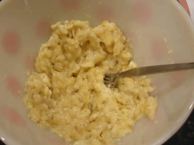 Pele todos tres y ponerlos en un tazón grande. Del puré hasta que se ven como la segunda foto. Puede utilizar una espátula o una cuchara de madera para esto, pero yo prefiero usar un tenedor para este paso. Las púas de metal de la horquilla de hacer el trabajo más rápido.