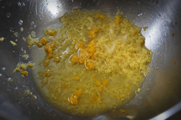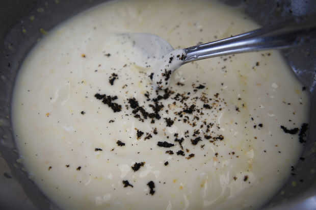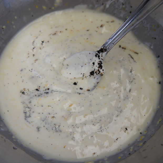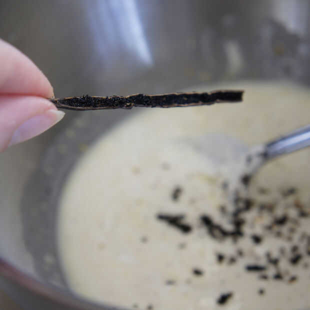 Las semillas de vainilla, cortar la vaina de vainilla por la mitad a lo largo y raspar las semillas con un cuchillo. Agregar y mezclar bien.