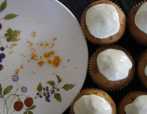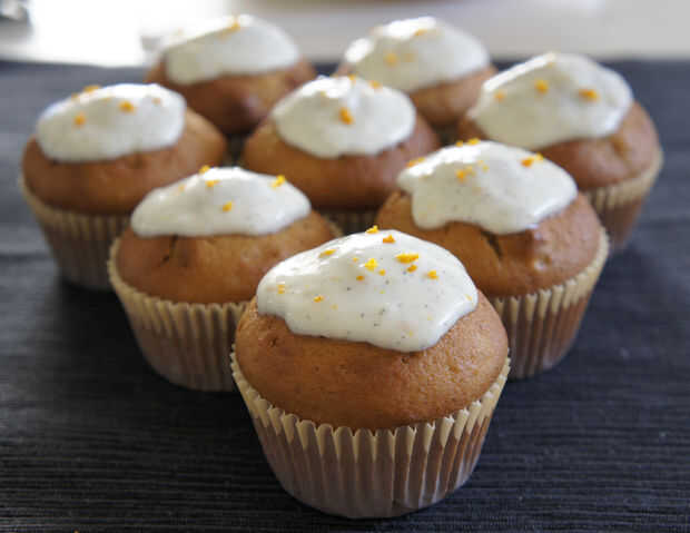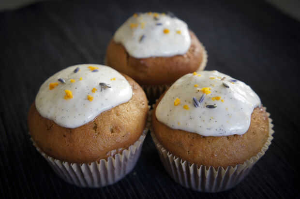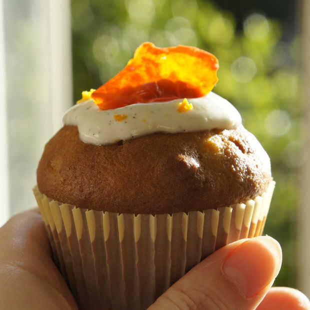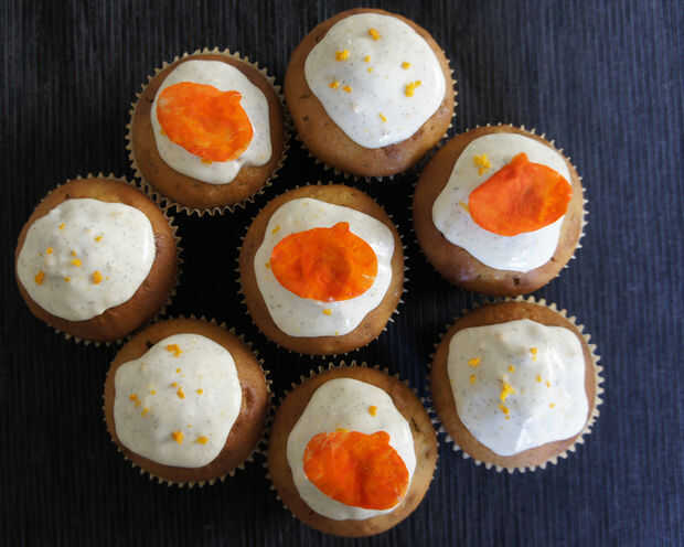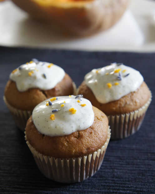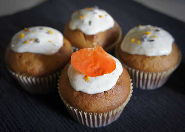 Ahora para el especialmente divertido parte! Espolvorea la ralladura de Clementina que coloca a un lado sobre cada muffin. Luego, añadir algunos toques de lavanda seco. Finalmente, coloque una calabaza forma en cada uno. Encontré que porque éstos fueron hechos de finas capas de pasta filo, la luz brilla a través de ellos muy bien.