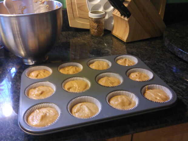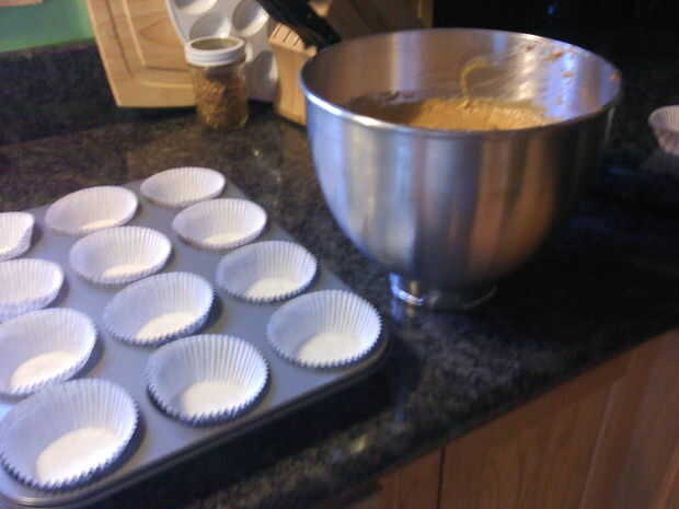 Tengo cada línea el la taza de mezcla para luego llenar con cuidado deje caer el forro completo en la bandeja, esto sólo termina siendo más ordenado y funciona bien para mí.