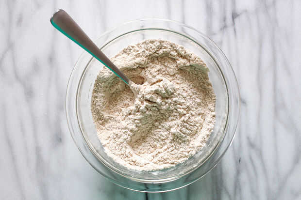 Mezclar la harina, sal, polvo de hornear y especias juntos en un tazón pequeño.