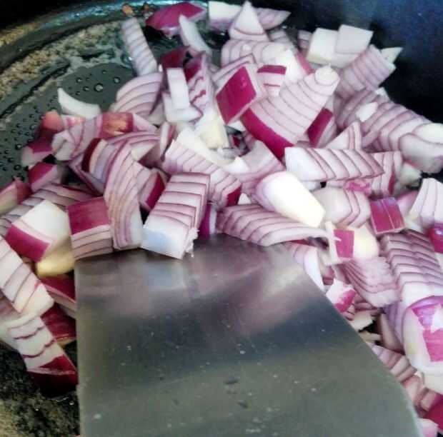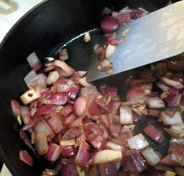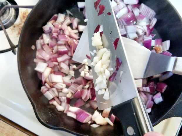 Vierta un poco de aceite de oliva en la sartén y gire el quemador hasta medio. Una vez que el aceite comienza a shimmer añadir la cebolla y el ajo. El truco aquí es dejar que la cebolla se sientan bastante a brown pero no quema. Así que pruebo y sólo les agregue 6 - 8 veces mientras cocina. Una vez que empiezan a aclarar y asumir algunos bordes marrón agradables apague la hornilla y deje que se enfríe la cebolla.